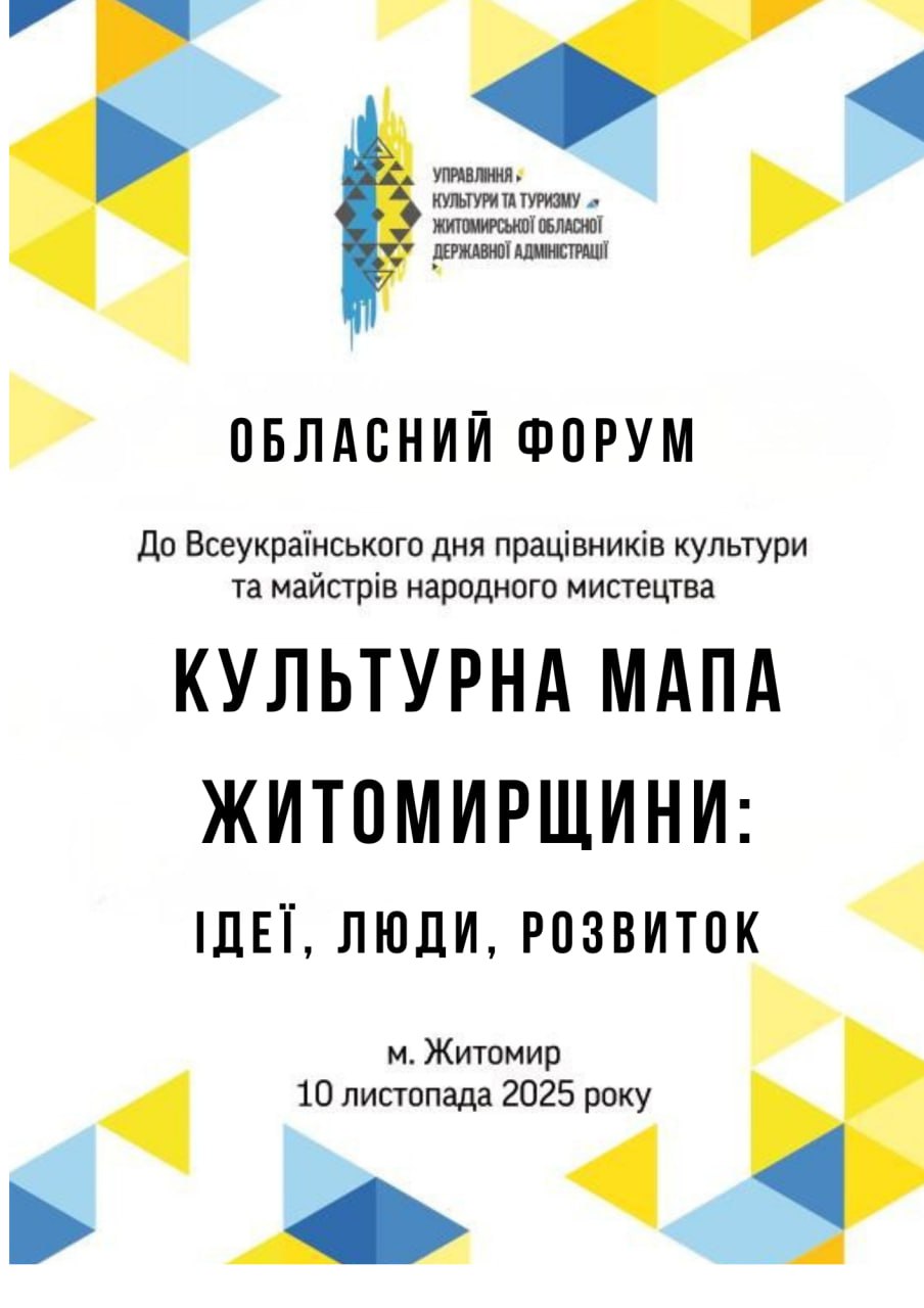 10 листопада 2025 року в Житомирському обласному краєзнавчому музеї відбувся обласний форум «Культурна мапа Житомирщини: люди, ідеї, розвиток», організований Управлінням