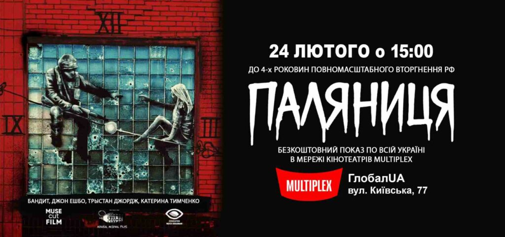 До 4-х роковин повномасштабного вторгнення рф у мережі кінотеатрів Multiplex по всій Україні відбудеться безкоштовний показ документального фільму «ПАЛЯНИЦЯ» (16+). ПАЛЯНИЦЯ / PALYANYTSIA Дата: 24 лютого 2026Початок: о 15:00 Країна: Україна, 2025 Хронометраж: 64 хв. Жанр: документальний Режисер: Кадім Тарасов, Юлія Большинська Продюсери: Катерина Тимченко, Ryan Smith Сопродюсер: Андрій Різоль Герої проєкту: Bandit (США), Tristan […]