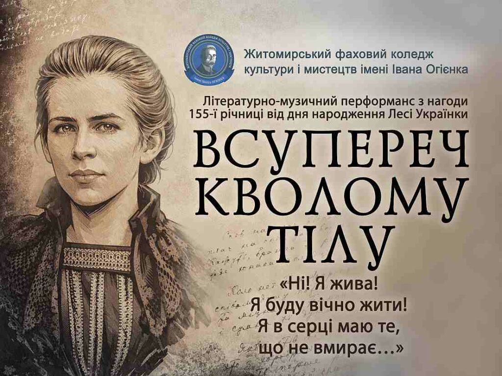 Житомирський фаховий коледж культури і мистецтв імені Івана Огієнка запрошує на заходи з нагоди 155 річниці від дня народження Лесі Українки 26 лютого о 15:00 у Житомирському фаховому коледжу культури і мистецтв імені Івана Огієнка відбудеться літературно-музичний перформанс «ВСУПЕРЕЧ КВОЛОМУ ТІЛУ» в рамках якого відбудеться відкриття виставки творчих робіт викладачів та студентів відділу «Образотворче мистецтво, […]