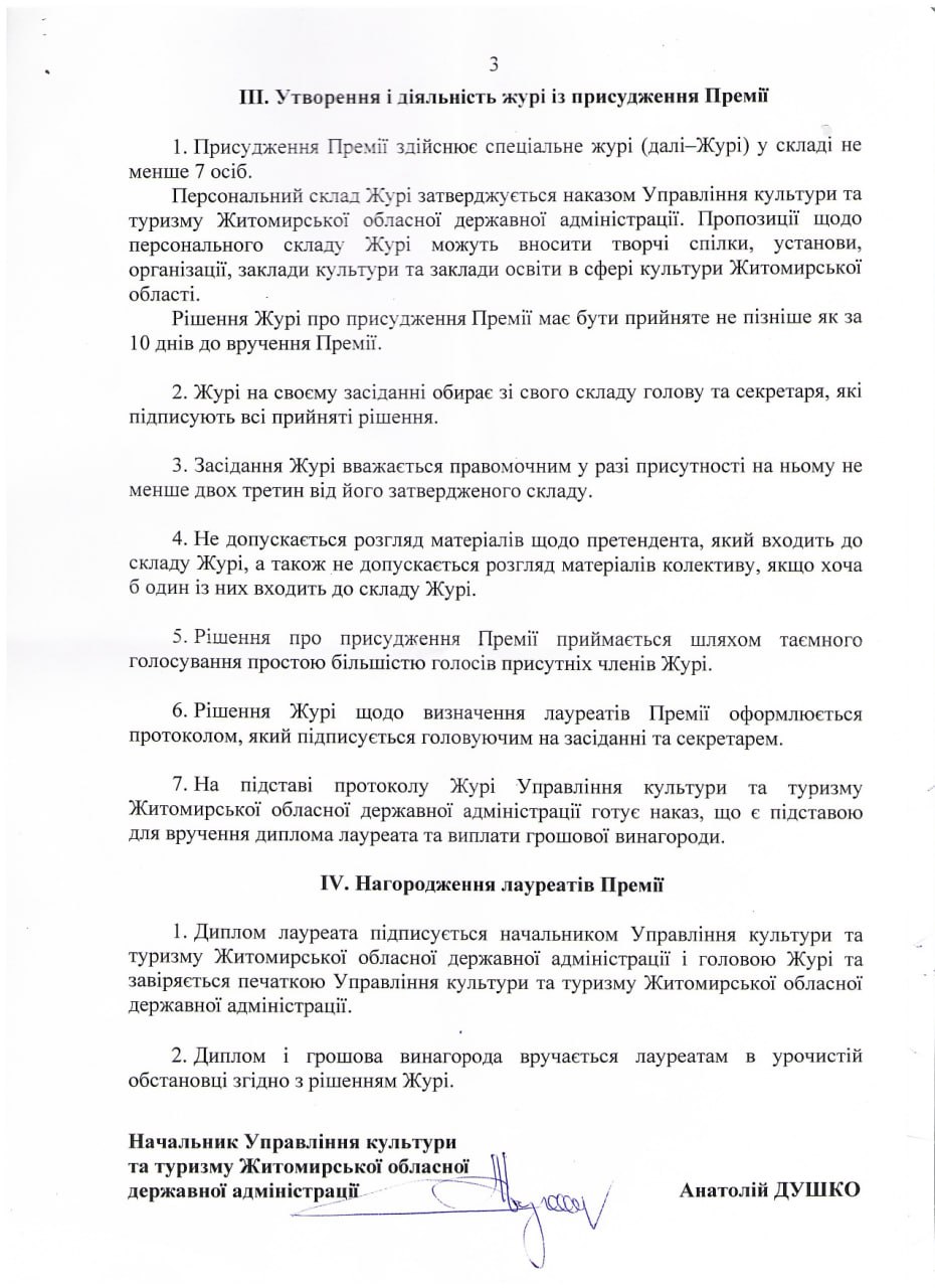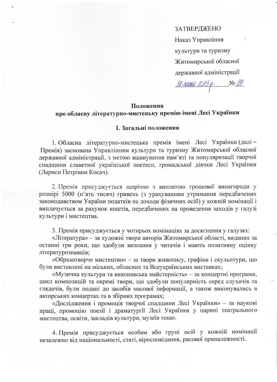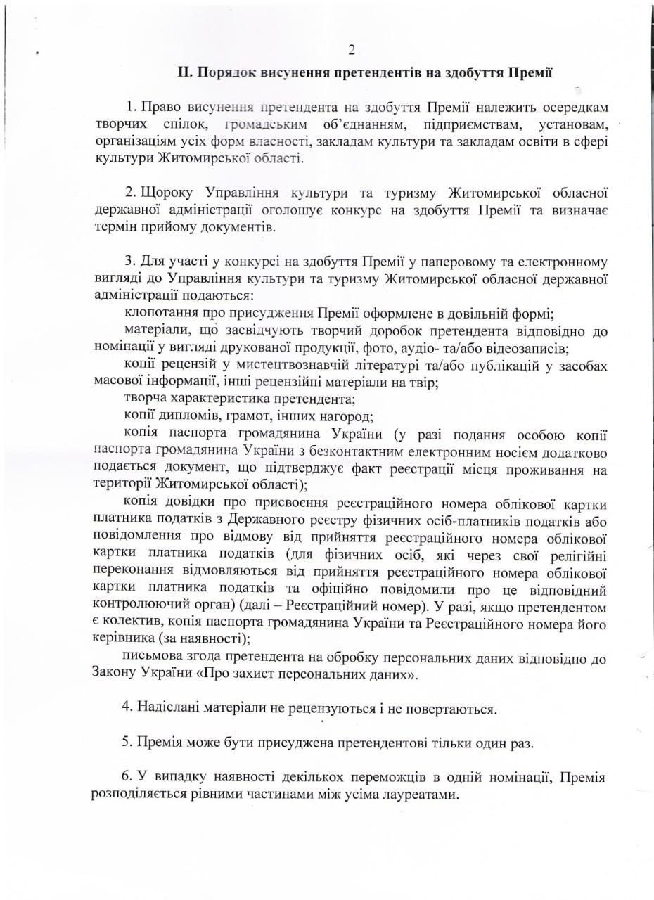 Премія присуджується у чотирьох номінаціях відповідно до затвердженого Положення (наказ Управління культури та туризму Житомирської обласної адміністрації від 31.07.2023 № 89).