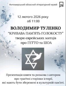 12 лютого в Житомирському обласному літературному музеї відбулася зустріч, присвячена осмисленню складних сторінок нашої історії через слово, дослідження та живу розмову – презентація книги Володимира Туленка «Кривава пам’ять Голокосту», приурочена до 80-річчя Міжнародного дня пам’яті жертв Голокосту.
