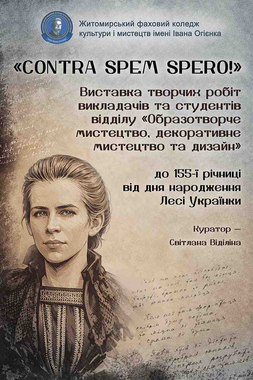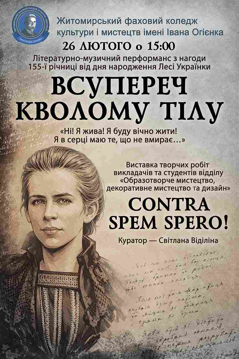 Житомирський фаховий коледж культури і мистецтв імені Івана Огієнка запрошує на заходи з нагоди 155 річниці від дня народження Лесі Українки