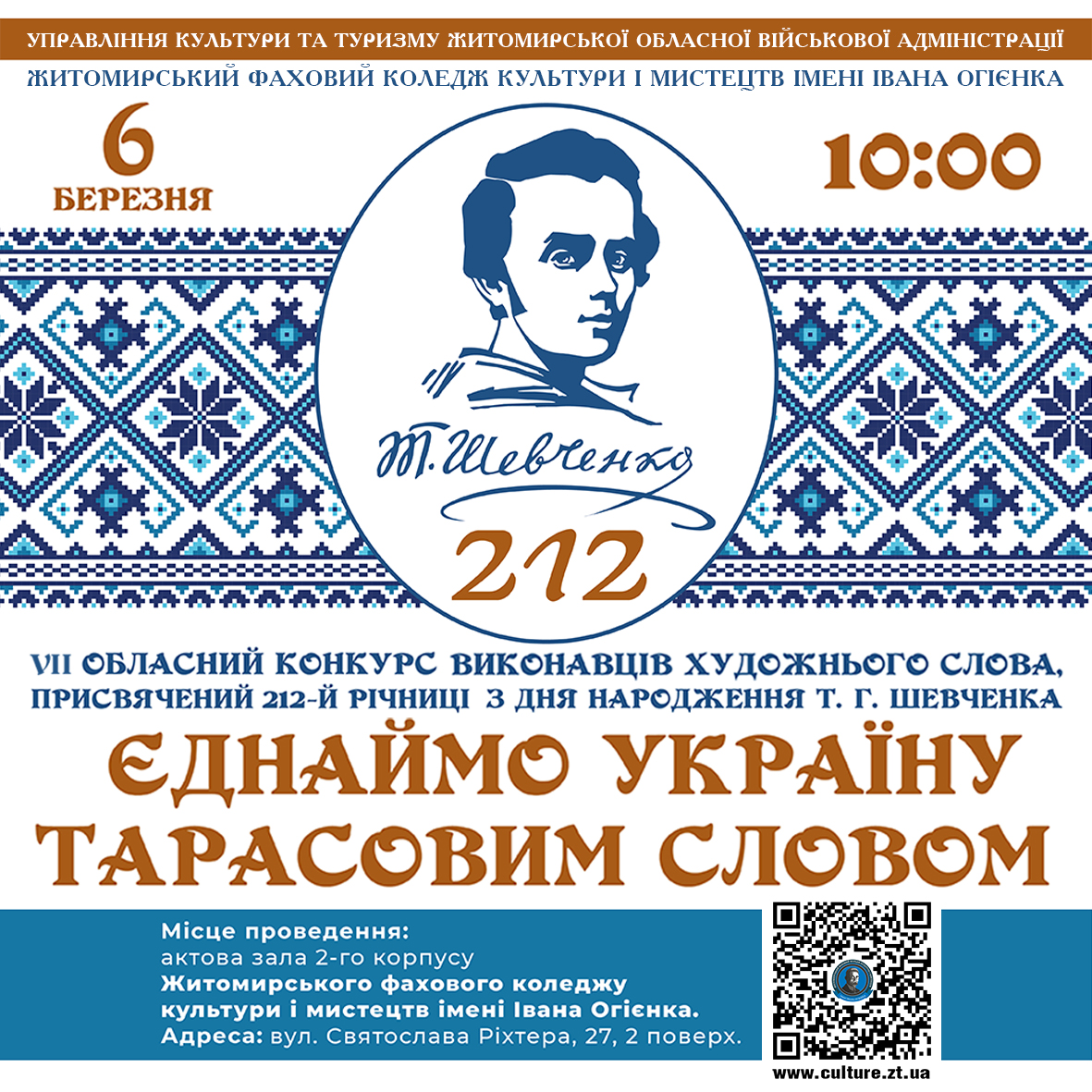 6 березня на базі Житомирського фахового коледжу культури і мистецтв імені Івана Огієнка спільно з Управлінням культури та туризму Житомирської обласної військової адміністрації традиційно відбувся VІI обласний конкурс виконавців художнього слова, присвяченого 212-й річниці з дня народження Т. Г. Шевченка «ЄДНАЙМО УКРАЇНУ ТАРАСОВИМ СЛОВОМ»