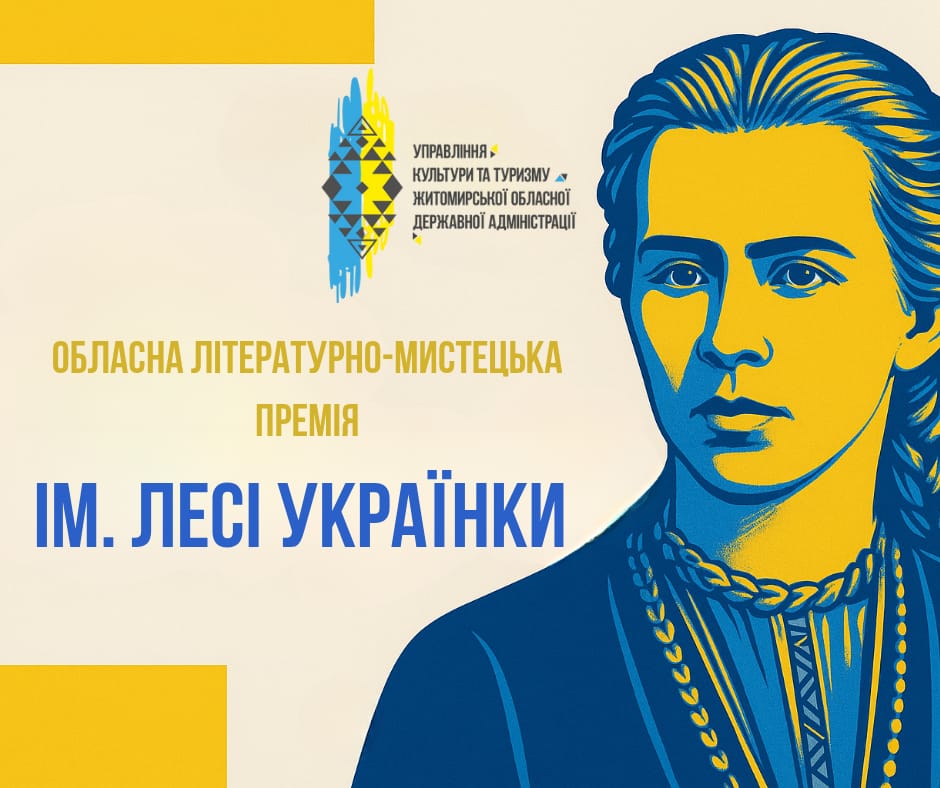 Управління культури та туризму Житомирської обласної військової адміністрації нагадує про оголошення конкурсу на здобуття обласної літературно-мистецької премії імені Лесі Українки.