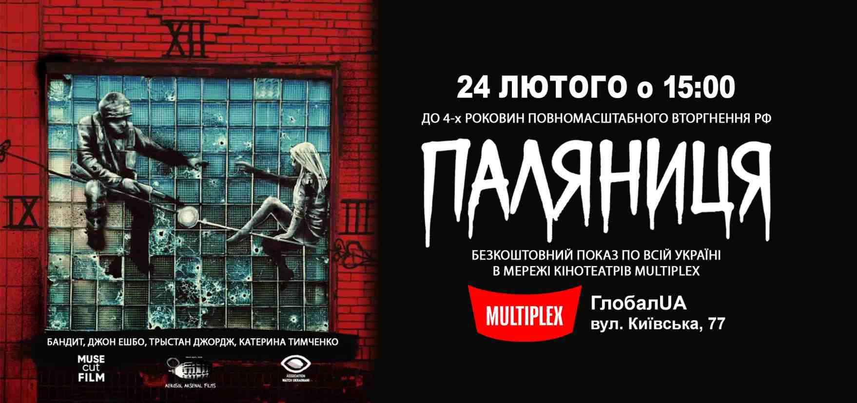 До 4-х роковин повномасштабного вторгнення рф у мережі кінотеатрів Multiplex по всій Україні відбудеться безкоштовний показ документального фільму «ПАЛЯНИЦЯ» (16+). ПАЛЯНИЦЯ / PALYANYTSIA Дата: 24